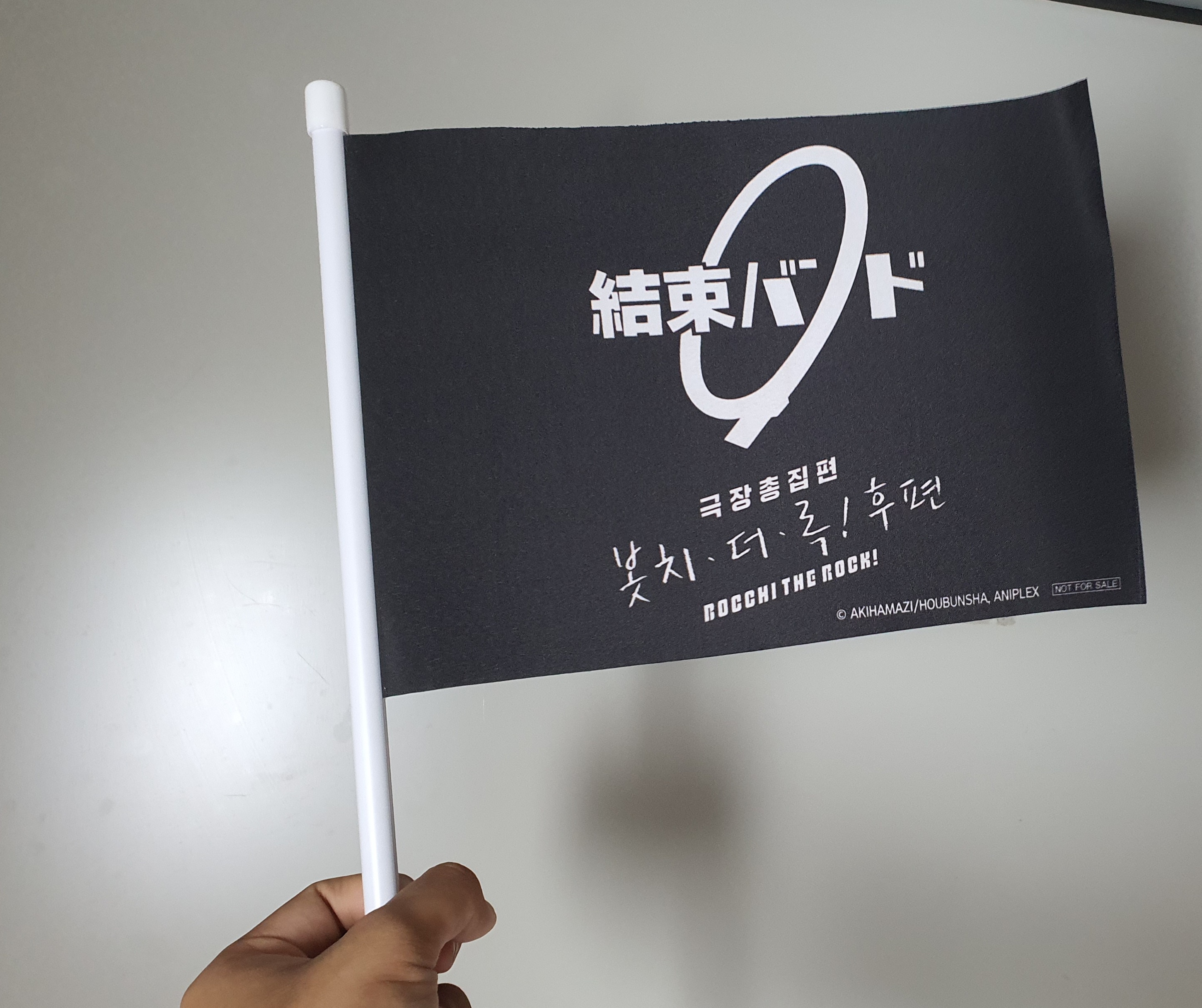 먼저 깃발입니다. '결속밴드'라고 일본어로 적혀있고 밑에는 한국어로 번역되어 적혀있습니다. 깃발의 크기는 생각했던 것보다 작았습니다. 대략 A4용지 1장 정도의 크기였습니다. 그럼에도 불구하고 집에 장식할 수 있어서 괜찮은 크기라고 생각합니다. 그리고 깃발의 재질은 천이나 면 소재입니다. 소재는 나쁘지 않은 것 같습니다.